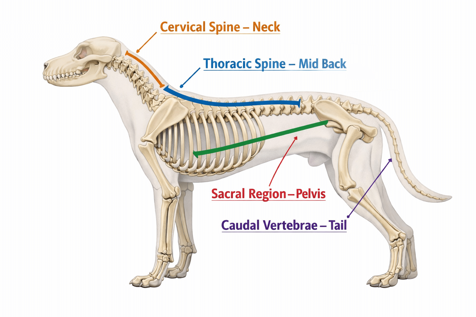 The canine spine is divided into five major sections. Each region has a specific role in supporting movement and protecting the spinal cord.
