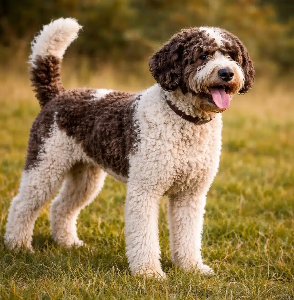 The Lagotto’s coat is one of its defining features. It should be dense and curly rather than soft or fluffy, giving the dog a rustic and functional look suited to outdoor work.